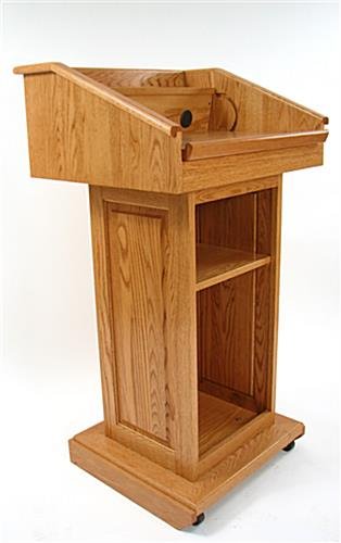 This solid wood podium is an all-in-one lectern for any application. Featuring hidden casters, the entire unit can be moved by simply tilting it backward. This solid wood podium can also be converted to a countertop display by removing the top section. Depending on the need, the reading surface is adjustable to create a flat or angled shelf. The solid wood podium’s interior provides storage space and a removable shelf. Two cutouts conceal cords and wires.