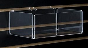 This slatwall bin is a 10″w x 6 ¼”d x 3 ¾”h acrylic container designed to hold sample products, bulk merchandise or other small, loose items. Like the rest of our slatwall accessories, this slatwall bin easily attaches to any of our slatwall displays without the use of any tools, adhesives or mounting materials. Just slide the attached hooks into your slatwall panels and fill with products! Made with clear materials, each slatwall bin is a simple, yet durable product that will not break or scratch easily. These slatwall containers are great for retail, convenience, and grocery stores that have small products or samples to display.