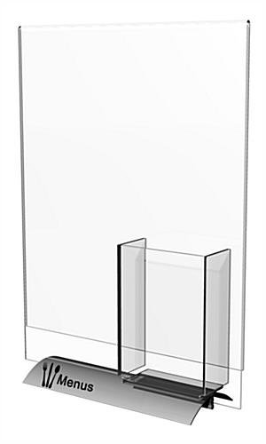 This stand up 11” x 14” sign display with custom logo features a 4” wide brochure pocket. A necessary marketing tool, these acrylic frames allow for information distribution in a variety of locations and establishments. Each business sign display is great for a store, school, hospital, office, or business trade show! Design a 1 color custom logo to be imprinted in vinyl on any stand you purchase. This sign display is completely customizable. As an added convenience, the upscale silver base detaches from the acrylic frame and brochure pocket, allowing for easy business trade show or store storage.