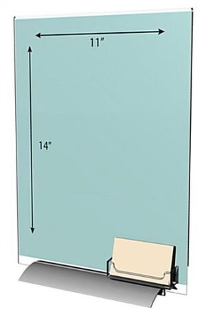 This vertical 11” x 14” signage frame with custom logo includes a business card pocket. Also great for holding gift cards, this office display captures the attention of customers with its large poster area. Made from clear acrylic, this business signage frame features a silver snap base with an attractive design. This construction allows the unit to disassemble for storage and travel. Each signage frame includes custom vinyl printing so businesses may add their logos to the display. From trade shows to doctor’s offices, these acrylic office sign products are sure to impress with their design and function.