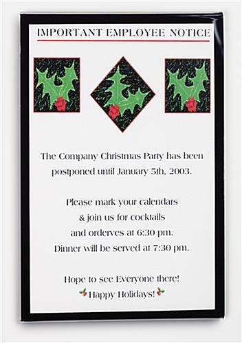 This 11 x 17 poster frame provides a classy way to display your advertisements, art, or notices with an attractive, durable, easy to use wall mounted sign holder. The sign holder is fabricated from clear acrylic and features a 1/2″ silk screen black border. The poster display, 11 x 17 poster frame has a contemporary design for use any business environment. This plastic frame such as the sign holder, or photo display, comes in one piece and can be wall mounted with ease. Due to its enclosed design, this 11 x 17 poster frame features a small notched slot in the center of the top back flap, enabling you to easily hang the frame over a small nail head or screw. We also supply the acrylic sign holder with double sided stick mounting squares, for a nail-less mount.