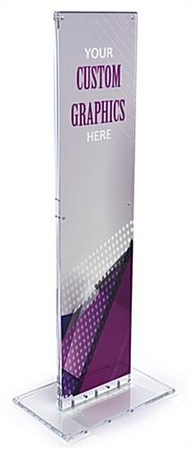 This indoor acrylic floor sign totem display is suitable for a variety of industries. Included between the clear upright panels is a poster plate measuring 11.6875” x 46.6875”. Format custom designs for the double-sided floor sign totem display. Magnetic button closures secure the promotional poster within the frame stand. The blank plate provides a large format field for advertising or wayfinding signage. With a solid base and sturdy uprights each frame stand withstands heavy foot traffic with ease. Use the totem display for impactful marketing for your business!
