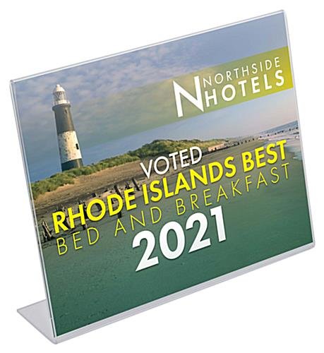 This tabletop sign display is angled to show off it’s 11″ x 8.5″ graphics with ease. These marketing displays work great as tabletop literature displays or as a countertop ad holder! Simply slide paper in the back or sides for fast changes. Because these sign displays are made in-house at our Workshop with high quality acrylic, you can trust that you’re getting a product worth every penny!
