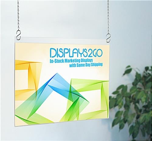 These acrylic poster hangers include a 17″ x 11″ acrylic frame and all the necessary hardware to hang from a ceiling. The ceiling hung frame has a non-glare acrylic which reduces annoying light reflections for a clearer view of your posters. These acrylic poster hangers that are hung from overhead allow businesses to free-up valuable wall and floor space for other enticing advertising signage. This kit comes complete with a hanging hardware kit for suspended ceilings that includes two 10′ lengths of chain, 4 S-hooks and ceiling clips (all metal). The print change outs are easy with these acrylic poster hangers. Simply slide the signs in from either side to remove and replace. The signs can also be inserted back-to-back in these acrylic poster hangers for double-sided viewing.