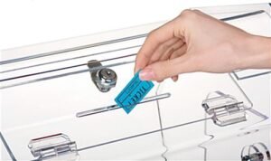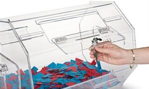 This raffle box has a spinning body that is made from 3/16″ thick acrylic and comes in an attractive octagonal design. The raffle drum has a hinged lid and a 6″ wide slot for inserting the tickets. To ensure the security of your contents, we sell this raffle drum with a built in camlock and two included keys.