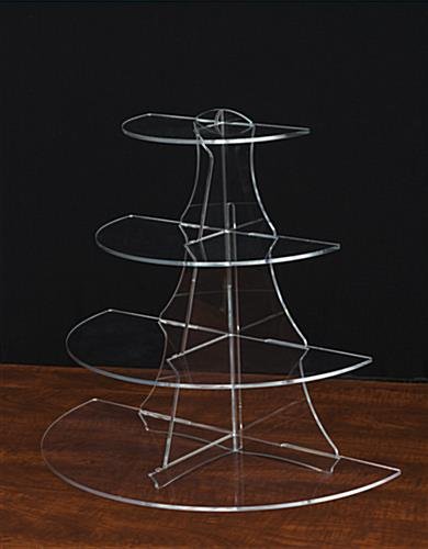 This 4 shelf acrylic stand is a 1/2 round fixture that looks great in display cases to showcase different retail products! Sit this clear riser flush against a wall or leave it on an open counter to create a dynamic and effective presentation of goods for your boutique or bakery. The four cascading shelves that range from 9.25” to 18.5” wide provide plenty of space to organize products on the retail stand. Small or large merchandise can be showcased between the 4.75” clearances of each clear tier. Although the knock down design of the stand ships flat, it is easily and quickly assembled by connecting the crossbars and sliding each wedge into the designated spot. Whether in retail shops or bakeries, this riser looks great anywhere including inside large glass display cases to showcase special items!