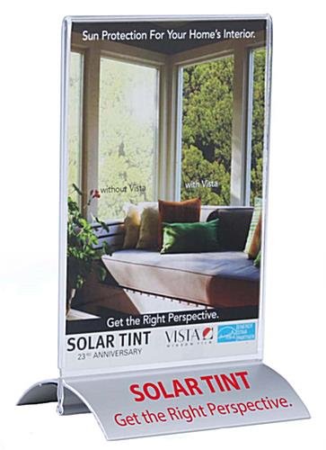 This 4 x 6 sign frame with custom base is a great way to promote your business. These double sided holders are made with a clear acrylic that will beautifully showcase your graphics and a sturdy silver aluminum stand. Whether you need to display a new menu or to promote a sale on some of your products, this acrylic sign frame is a low-cost, effective way to advertise. New graphics can be inserted at any time, as the stand snaps-open for you to remove the acrylic and insert the new sign in the double sided acrylic. These holders also come with a color vinyl option to display your business name and logo, available in 10 vibrant colors that will stand out well against the silver neutral stand. Try a sign frame today to showcase your products!