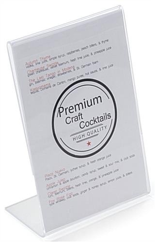 This table sign holder that is slanted provides an optimal viewing angle for passersby. Place this economical menu card display on every tabletop in a restaurant to promote new menu items or a weekly drink special. This table sign holder is an economy frame that is inexpensive yet durable. The sides of the acrylic framing are frosted and not clear like other similar units sold on this site. Most casual observers will not even notice this feature. Buy this table sign holder, also known as a table tent, in larger quantities to have replacements on hand.