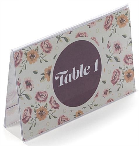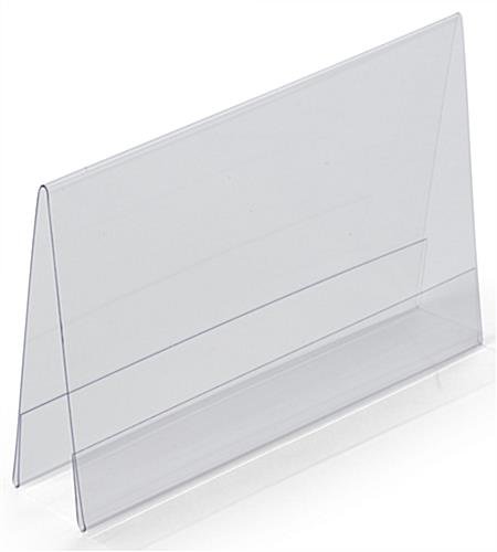 These plastic frames, cheap place card holders can be used in delis to identify food items, for customers to easily find the price of an item. Restaurants could also make use of these tent style displayers, to display daily specials or dessert listings. Cheap place card holders with an A-style design, like the ones seen here, are a great addition to any business. These cheap place card holders that feature a fold-over design permit fast and easy graphic changes, as they feature a side-insert design! This countertop plastic display is perfect for use in locations needing to update their signage often! Cheap place card holders that are double-sided, like the ones seen above, maximize your graphic exposure with a double-sided design. Sold at an inexpensive price, this plastic a-frame enables users to display signage without having to break their budget. These menu card holders are available in many other sizes in this online catalog.