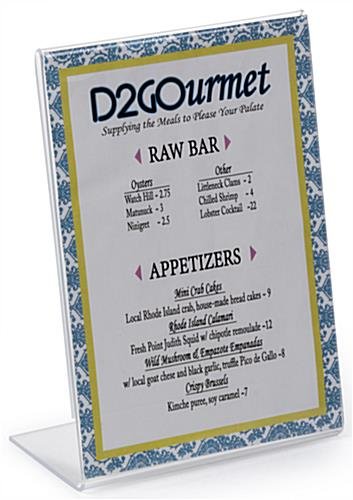 This budget picture frame is a suitable restaurant sign holder or a desktop display! The simple fold-over design makes this a popular choice for businesses that need a fixture that is easy to change and maintain. This budget picture frame that is made of acrylic is easy to update with new graphics. Simply slide the old photo out through the side and replace with a new image via the opposite side. Each budget picture frame features a base that is 2-1/2″ deep that keeps the sign holder steady. This economical menu card holder is made with one piece of quality acrylic. This budget picture frame with a seamless design is durable and will last through years of use. Place this inexpensive photo holder in a lobby or business office to post vital information for guests and customers.