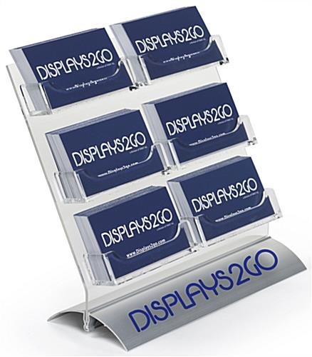 This multi-pocket card display with custom logo works well as both a business contact information stand and a retail gift certificate holder. There are a total of 6 slots for holding these important vouchers and graphics. Each business card display is made of clear acrylic and clips into a silver base. One can easily take the holder apart for convenient storage. Place the card display on an office reception desk or on a retail store checkout counter. Users may customize the unit with simple 1 color vinyl graphics.