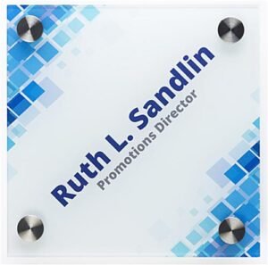 Outfit your office, conference room, or classroom building with a custom 6 x 6 standoff wall sign to display wayfinding information. Each acrylic name plate is printed using UV technology for a high-resolution image in any colors of your choosing. The square 6 x 6 standoff wall sign comes with a set of four hardware spacers for mounting outside of rooms. Display logos, conference areas, or other information on these acrylic name plates for a modern look. The office signage can easily be created using the downloadable templates found below. Standoff wall signs such as this can be helpful for showcasing wayfinding information in a clean and professional manner.