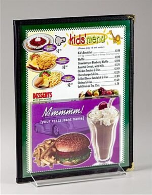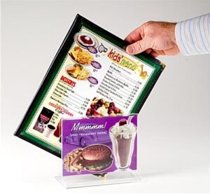 This restaurant menu display features a unique design that accommodates two 7″ x 5″ signs as well as a channel to house additional menus. Casual dining facilities use this table tent to promote new food items, or to advertise drinks on tap. This restaurant menu display, also called a table sign features a fold-over acrylic construction that is durable and relatively inexpensive. Sign change-outs are simple, and take just a few seconds to complete. This restaurant menu display, acrylic frame features open ends to allow the user to slide the old prints out. There are no plastic clips or fasteners to contend with, just a slight bend of the frame and the inserts slide in and out. Each restaurant menu display features a one inch gap in between the two sign frames that is typically used to organize menus on the tables. The 7″ x 5″ frames provide adequate support, and doesn’t take up too much space on the tabletop.
