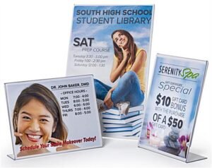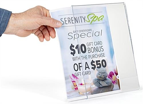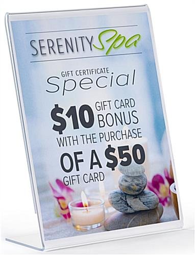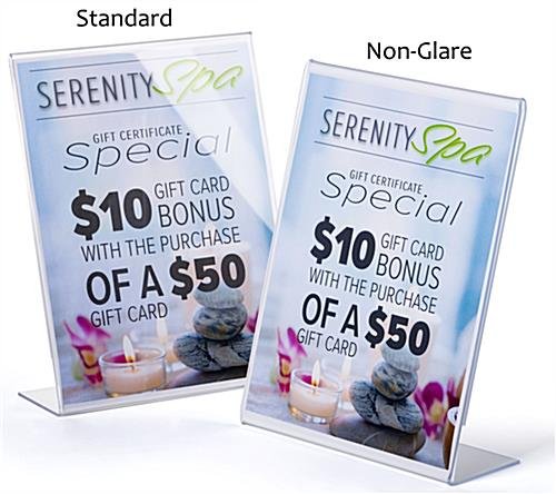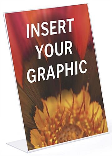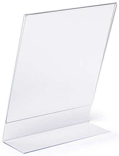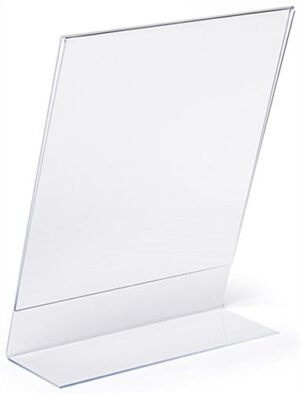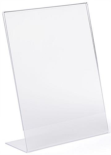 This slant back non glare acrylic sign frame is a perfect display product for any retail table or countertop. The picture holder is seamless and reflection free. Our slant back acrylic sign frame with slide in design will help to create the perfect display opportunity for your important retail or office messaging. The 8.5” x 11” portrait size features polished sides and the reflection free finish allows you a wide variety of communication options, picture displays, or branding and logo prospects. The angled and open-side construction of this seamless holder allows you to easily change and update your marketing presentation. Purchase this slant back sign frame in bulk quantities for savings on signage and greater brand awareness.