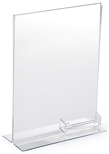 Custom Business Card Holder with Acrylic Sign Display – A Top Seller! This sign display with a business card holder is 8-1/2″ wide x 11″ high. Slide paper in the back of the sign frame for fast changes. This sign holder has a standard size business card pocket for your company’s information. Great as a tabletop display!