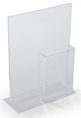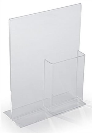 Are you shopping for an acrylic sign display that includes a frame along with a pocket for brochures? This versatile combination unit is like getting to fixtures for the price of one. Each acrylic sign display, also known as a print frame is made with high quality materials. The literature holder is permanently attached to the lower right corner of the framing. This signage holder is the perfect acrylic sign display one would want to use in a lobby or reception area. Print changes are simple with the bottom loading design. Flip the signage holder, acrylic sign display upside down and pull out the old graphics and slide in the new images. It is a simple process that can be done in seconds. This acrylic sign display that holds an 8.5″ x 11″ graphic is ideal for use on a countertop or desktop in an office or business waiting room. This “T” style stand has a single literature pocket for 4″ wide pamphlets.