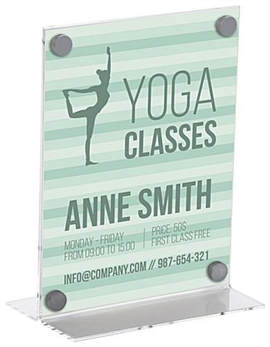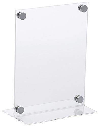 With a timeless T-style design, this 8.5” x 11” custom table tent provides a sign frame suitable for any business. Printing inserts can be done right on your own printer, making this unit a versatile piece that can be updated as needed. Showcase sale promotions, restaurant specials, or business hours within each clear acrylic table tent. Printing and swapping out inserts in the sign frame is easy by unscrewing the silver screw cap hardware. Each table tent allows advertising for sale items or business announcements printed on a standard sized sheet. Update your sign holders with a sleek clear acrylic unit sure to come in handy for many years!