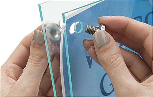 This professional acrylic sign holder frames standard 8.5” x 11” paper in a sleek manner. Included in the clear display kit are 6 film sheets, 3 frosted and 3 unfrosted, with a cutout on each for easy printing at home. Designed with green edge quality plastic, this retail sign holder looks clean and attractive for most commercial countertops. Bind the custom poster into the frame between the two pieces of plastic and secure with the four stainless steel standoffs. These binding screws for the sign holder featuring a front loading style are not only functional but provide extra flair for the clear display. The slant back design of this retail countertop signage makes the poster more visible to passerby.