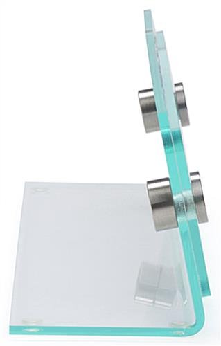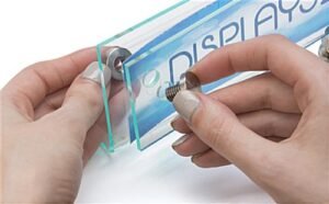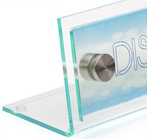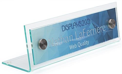 This desk name plate holder is a great custom office sign for reception areas and executive suites. Frame the job title or position held within your company and keep it on display for customers. Make an area look professional by utilizing one of these business name plates. Design a custom title in an 8” x 2” area and print at home on the provided paper with the premade templates. Sold with this name plate is 3 pieces of clear and 3 frosted film that is already cut out for easy business application. Two stainless steel standoffs keep the office sign together on either side of the frame.
