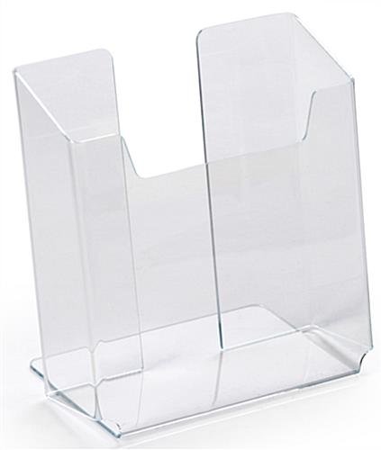 This table brochure holder is a customer favorite! This unit features a modern clear acrylic design and can accommodate standard 5-1/2″ wide brochures. This lightweight unit has a flat base for stability and a single pocket to display your informational literature. Our table brochure holder is a great way way to communicate important information to patients in medical facilities, clients, or customers.