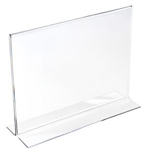 This custom printed acrylic sign holder features 11″ x 8.5″ advertisements in a landscape orientation. The tabletop displays include personalized graphic printing on the base, made with a high quality UV digital imprinting process. This means that each custom acrylic sign holder can feature company logos and promotions in full color with vibrant shades. The T-style promotional displays can feature a different graphic on each side for a double sided showcase. Our custom sign holder makes it easy to change images with their bottom loading design.