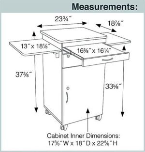 - Measures 23.75W x 18.875D x 37.375H inches; Two drop leaf side shelves that measure 18.25W x 13D inches each; Easy Glide Pullout Laptop or Keyboard Shelf measures 16.375W x 16.25D inches