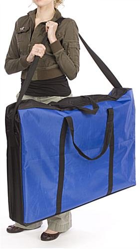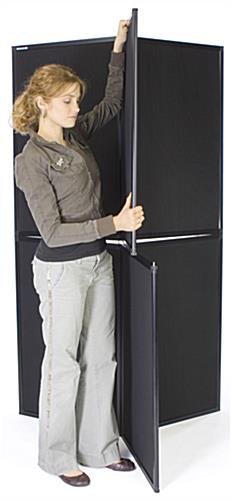 Looking for an affordable exhibition system to use at art shows and other temporary events? Our portable display wall panels are not only priced right, but also built to last. Each board boasts aluminum frame construction for a warp-free presentation. The portable display wall panels feature hook and loop receptive black fabric surfaces, but you can also simply use pushpins for attaching your items. The spindle design forms a central axis with three sections evenly separated. This provides a compact, yet sizeable area for your presentations with 360° accessibility. Moreover, each portable display wall panel is double-sided, so you really have 12 boards to use in total. The entire assembly collapses quickly and folds flat into the carrying bag (included with purchase). This temporary exhibition system is tailor-made for schools, trade shows, and art fairs — why use anything else?